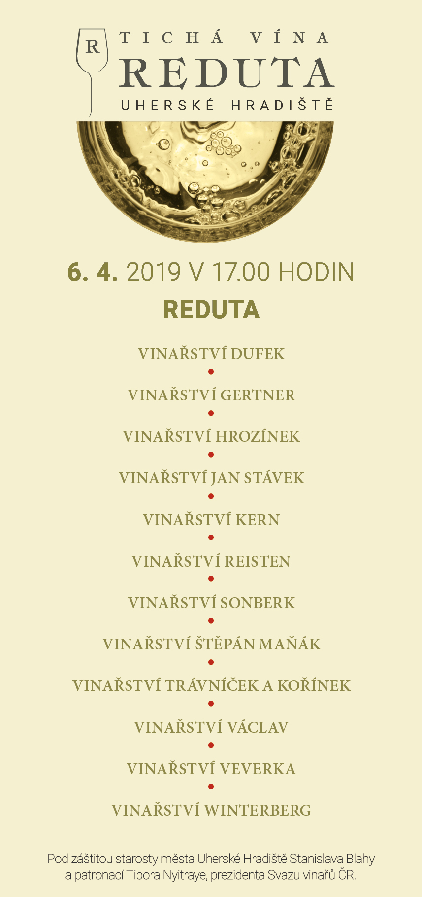 5. ročník exkluzivní degustace vín z dvanácti vinařství: DUFEK, GERTNER, HROZÍNEK, JAN STÁVEK, KERN, REISTEN, SONBERK, ŠTĚPÁN MAŇÁK, TRÁVNÍČEK A KOŘÍNEK, VÁCLAV, VEVERKA a WINTERBERG. Uvítáme vstup ve společenském oděvu. Tóny klasické hudby přinese komorní soubor Con Amore.