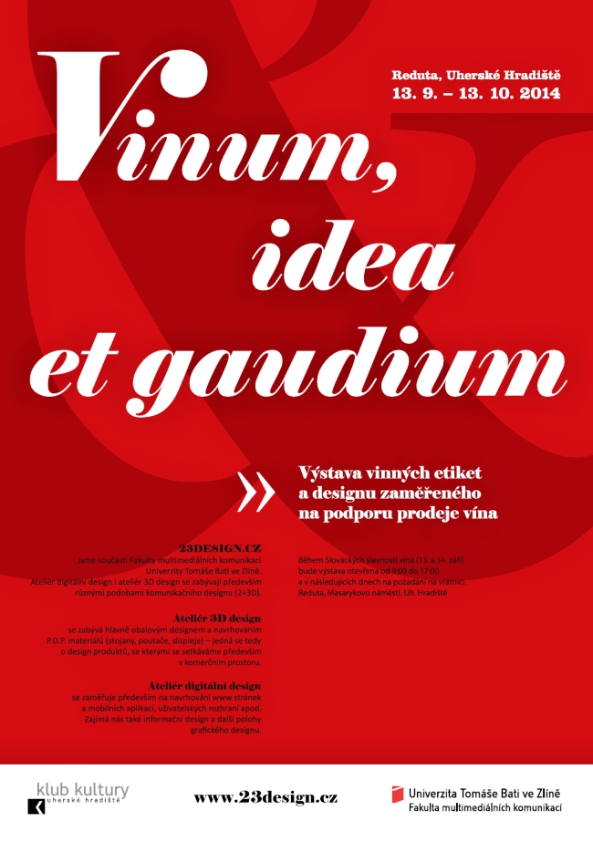 Pro návštěvníky letošního ročníku Slováckých slavností vína a otevřených památek 13. a 14. září je na půdě barokní Reduty připravena rovněž i výstava vinných etiket „Vinum, idea et gaudium“ která zde potrvá až do 13. října 2014. Výstavu zabývající se propagací vinařského odvětví a designem zaměřeným na podporu prodeje vína, připravili studenti z Ateliérů Vizuální komunikace a 3D design Baťovy univerzity ve Zlíně.